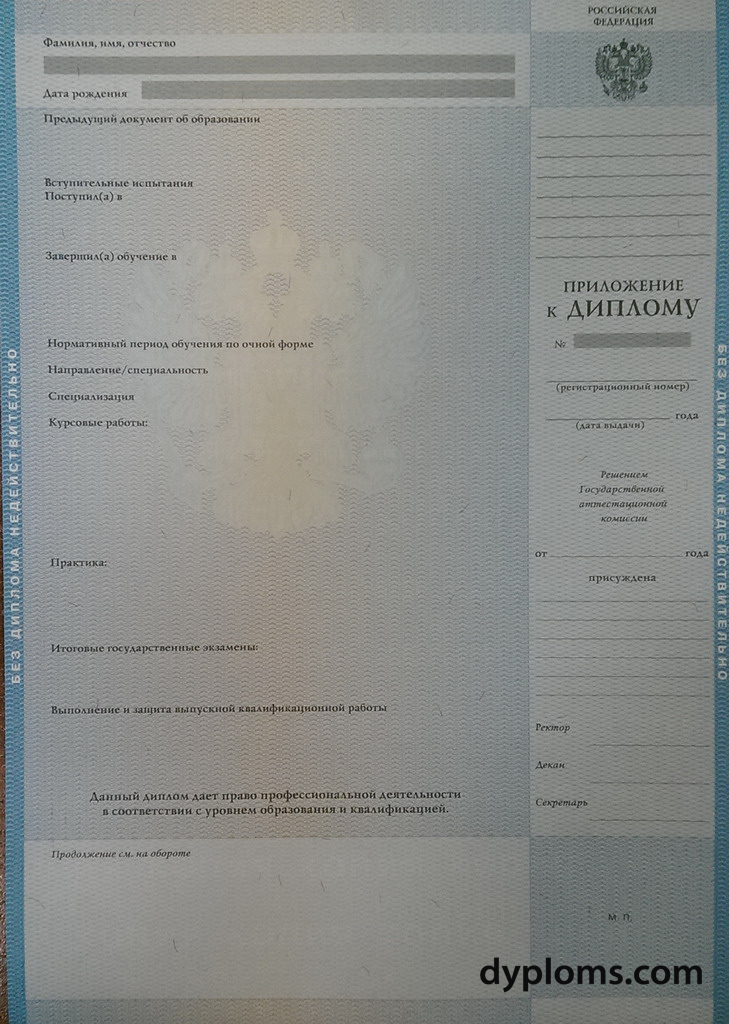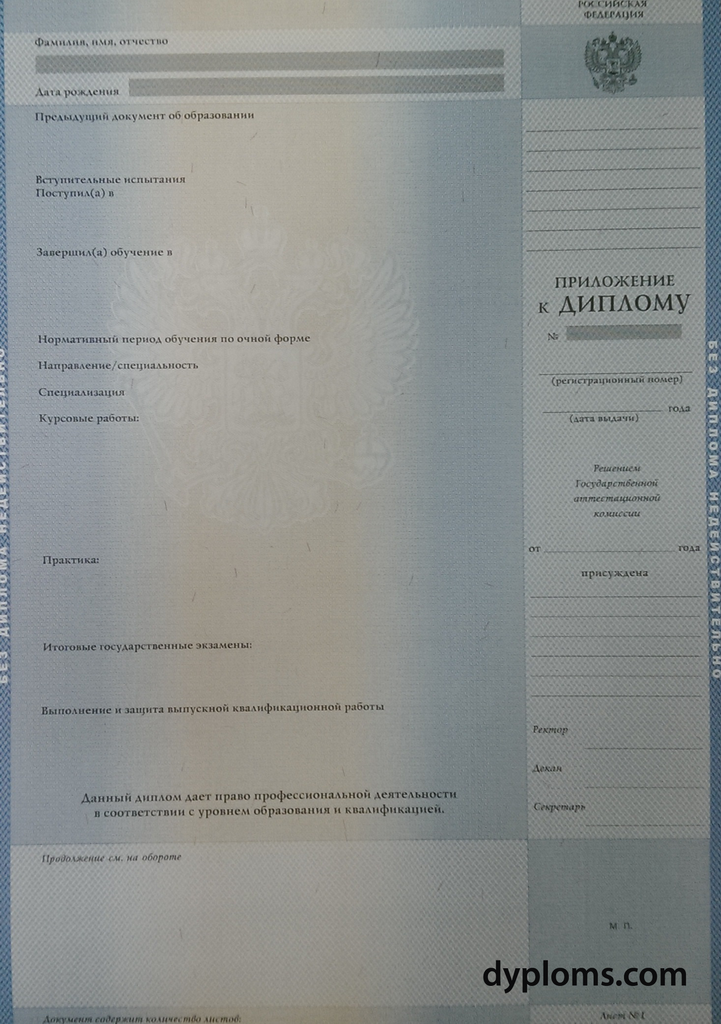 - Диплом актуального образца с государственными символами и защитными элементами.
